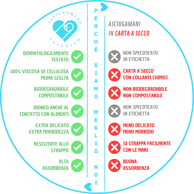 Ecco la spiegazione: i nostri asciugamani hanno un valore più alto perchè sono realizzati con materia prima più nobile, creati con cura offrendo la migliore qualità e prestazioni, dai un'occhiata a tutti i plus. Questa immagine rappresenta le caratteristiche a confronto tra i nostri asciugamani e i comuni asciugamani in carta a secco, goffrata o airlad.